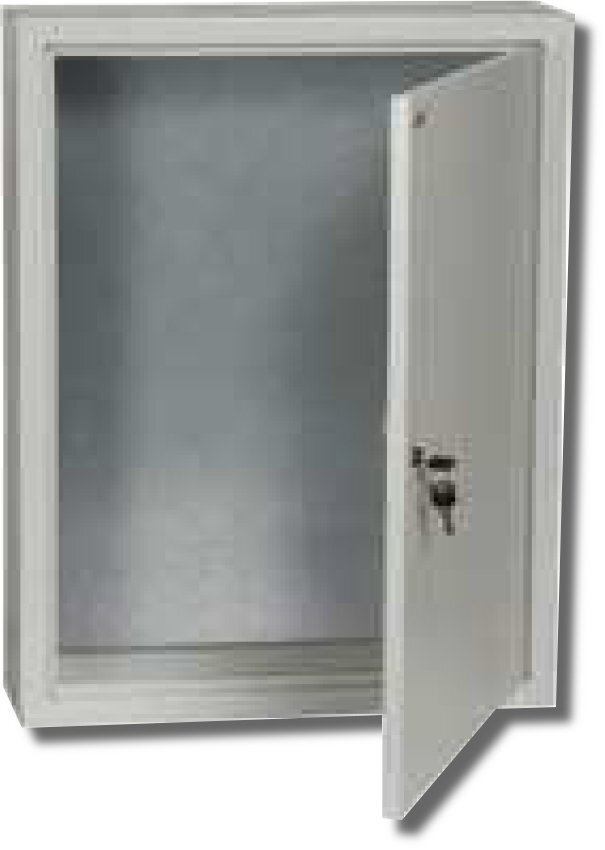 Сварной металлический корпус со съемной монтажной панелью. Дверца корпуса запирается на замок. Ключ замка имеет единый секрет.