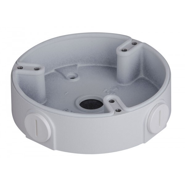 Коробка-монтажный обходной модуль (junction box) из алюминиевого сплава, предназначенная для установки камер видеонаблюдения, рассчитанная на монтаж поверх стены или потолка; диаметр корпуса позволяет скрытую прокладку кабелей, резьба подключения M20 (G1/2″), максимальная нагрузка до 1 кг, корпус белого цвета, рабочий температурный диапазон от −40 °C до +60 °C, допустимая относительная влажность до 90 % RH.
