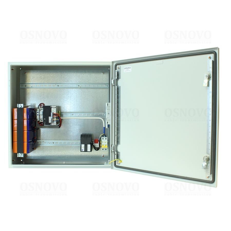 Уличная станция с оптическим кроссом + система обогрева+ резервное питание: 2 разъема SC (ложемент 8 КДЗС, пигтейл оптический одномодовый SC 0,9мм длина 1,5м 183x113x22мм); шкаф пластиковый; IP66, встроенные DIN-рейки: верхняя - 340мм, средняя 60мм, нижняя -60мм; набор гермовводов; автоматический выключатель 2P 220 В, 10A; обогреватель на DIN-рейке AC 230 В, 300Вт; резервное питание: аккумулятор свинцово-кислотный DC48В (7Ач,12Вх4шт);_x000D_