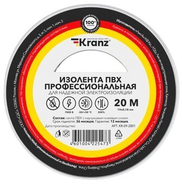 Лента изоляционная Kranz Изолента ПВХ профессиональная, 0,18х19мм, 20м, белая KRANZ (KR-09-2801)