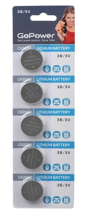 Литиевый элемент питания GoPower CR2032 GoPower, упак. 5 шт., БЛИСТЕР