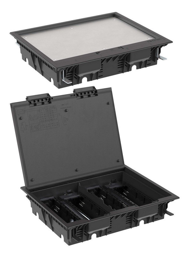 Назначение: организация рабочих мест в помещениях с открытым пространством. Установка в плиты фальшпола толщиной от 20 до 45 мм. Отверстие для монтажа 335х270 мм. Глубина монтажа от 72 до 108 мм. Крышка открывается под углом 110?, "утоплена" ниже уровня пола для монтажа напольного покрытия толщиной до 7,5 мм. Крышка усилена стальным листом, допустимая нагрузка - 450 кг. Ручка с запорным механизмом в одном из двух положений: открыто/закрыто. Монтаж ЭУИ "Brava", "Viva", "Avanti" и стандарта 45х45. Монтаж в четыре подрозеточных блока на 6 модулей каждый. Каркасы и рамки не входят в комплект, заказываются дополнительно. Комплект поставки: лючок 24 модуля; основание и дно подрозеточного блока 6 модулей – 4 компл.; винт M4x35 – 4 шт.; крепежный элемент 4 шт. – 1 уп. Цвет - черный