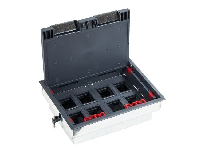 Люк напольный для розеток 8 постов (45х45 мм). Сталь. В комплекте: люк, суппорт (8 постов 45х45) - 1 шт., коробка с крышкой - 1 шт.