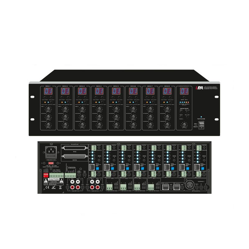 Аудио матрица серии MATRIX-8000 применяется для построения трансляционных и музыкальных систем. На вход прибора можно подавать до 9 источников звукового сигнала, каждый из которых можно направить на любой из 8 линейных выходов для дальнейшего усиления Регуляторы громкости для каждой зоны Регуляторы низких и высоких частот для каждой зоны Возможность одновременного подключения до 8 удаленных панелей управления. Отдельная зона мониторинга, для отслеживания сигналов трансляции на одной из зон матрицы (возможность выбора зоны мониторинга) Интерфейс пожарных сигналов для запуска сирены Приоритетный тревожный линейный вход Приоритетный вход для трансляции предзаписанного звукового сигнала Приоритетный вход для трансляции предзаписанного речевого сообщения Возможность подключения внешнего резервного питания 24 В Возможность расширения системы за счет аналогичных блоков (до 3-х блоков расширения) Приоритетный микрофонный вход