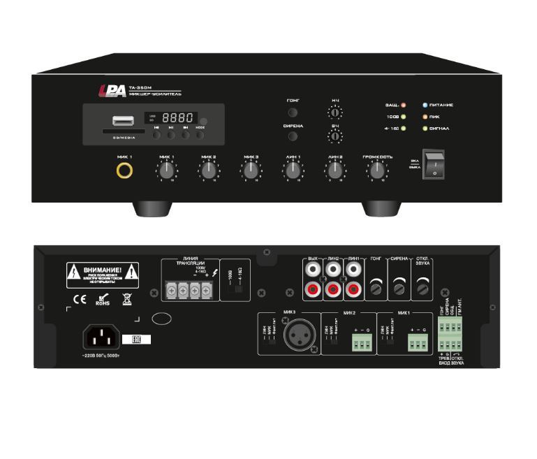 Мощность усилителя 350 Вт 3 линейных входа и 3 микрофонных входа Контакты тревожного сигнала Контакт сирены, отключения звука, сигнала привлечения внимания Раздельное управление чувствительностью каждого входа Защита от перегрузок, короткого замыкания и перегрева Индикация питания, сигнала, перегрузки, срабатывания защиты MP3-проигрыватель, FM-тюнер, Bluetooth Пульт дистанционного управления Настольное исполнение