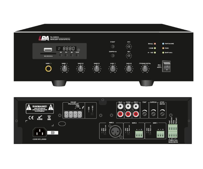 Мощность усилителя 500 Вт 3 линейных входа и 3 микрофонных входа Контакты тревожного сигнала Контакт сирены, отключения звука, сигнала привлечения внимания Раздельное управление чувствительностью каждого входа Защита от перегрузок, короткого замыкания и перегрева Индикация питания, сигнала, перегрузки, срабатывания защиты MP3-проигрыватель, FM-тюнер, Bluetooth Пульт дистанционного управления Настольное исполнение
