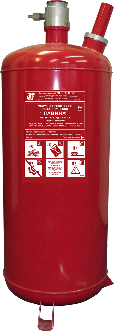 Модуль в зависимости от марки применяемого огнетушащего порошка предназначен для тушения пожаров классов А (горение твердых веществ), В (горение жидких веществ), С (горение газообразных веществ) по ГОСТ 27331-87 а также электрооборудования, находящегося под напряжением до 36 кВ, и применяются в автоматических установках порошкового тушения модульного типа для защиты производственных, складских и бытовых помещений как для защиты отдельных пожароопасных участков и отдельно стоящего оборудования, так и всей площади или объема защищаемого помещения.