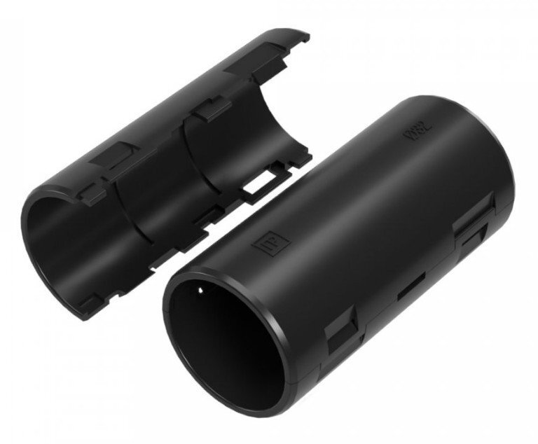 Муфта разборная позволяет соединять гофрированные и гладкие трубы различных типоразмеров без использования специальных инструментов, как при прокладке проложенной кабеленесущей трассе вновь, так и по ранее смонтированной системе труб, в том числе с переходом с гофрированной трубы на гладкую одного типоразмера.