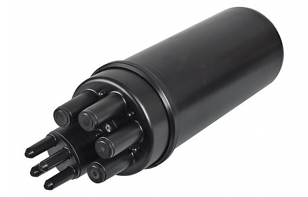 Муфта оптическая, 216 волокон, тупиковая, 4 круглых до 16 мм ввода/вывода, овальный до 10 мм/до 25 мм/транзит 4/2/1, с термо герметизацией корпуса и вводов ТУТ, КЗДС муфта в комплекте, наружное исполнение, до 6 сплайс кассет (1 в комплекте), -60...+70°C, 523x159 мм.
