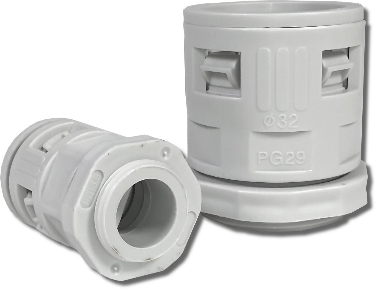 Муфта вводная снабжена удобным механизмом захвата трубы и фиксирующими элементами для сцепления с коробкой.