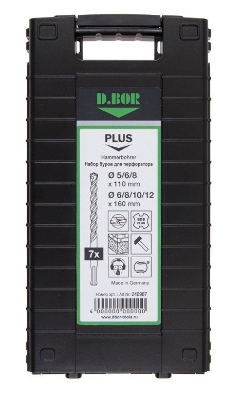 Набор буров SDS-plus серии V PLUS 7шт для бетона, кирпича и натурального камня (Бур SDS-plus V PLUS 5х50/110 мм - 1шт, Бур SDS-plus V PLUS 6х50/110 мм - 1шт, Бур SDS-plus V PLUS 8х50/110 мм - 1шт, Бур SDS-plus V PLUS 6х100/160 мм - 1шт, Бур SDS-plus V PLUS 8х100/160 мм - 1шт, Бур SDS-plus V PLUS 10х100/160 мм - 1шт, Бур SDS-plus V PLUS 12х100/160 мм), 2 режущие кромки
