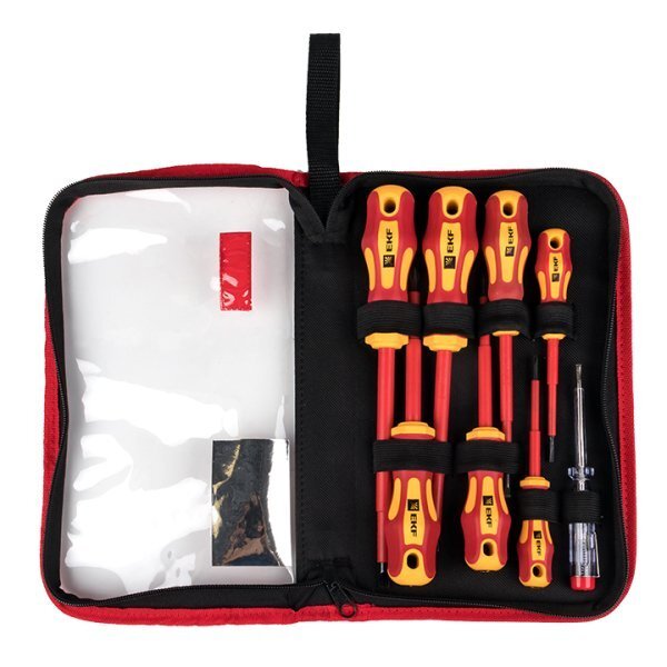 Набор диэлектрических отверток НИО-08 EKF Master: 1. SL3х75 мм 1000 В - 1 шт. 2. SL4х100 мм 1000 В - 1 шт. 3. SL5.5х125 мм 1000 В - 1 шт. 4. SL6.5х150 мм 1000 В - 1 шт. 5. PH0х75 мм 1000 В - 1 шт. 6. PH1х100 мм 1000 В - 1 шт. 7. PH2х100 мм 1000 В - 1 шт. 8. Отвертка индикаторная ОИ-1 - 1 шт. 9. Мягкий пенал - 1 шт.