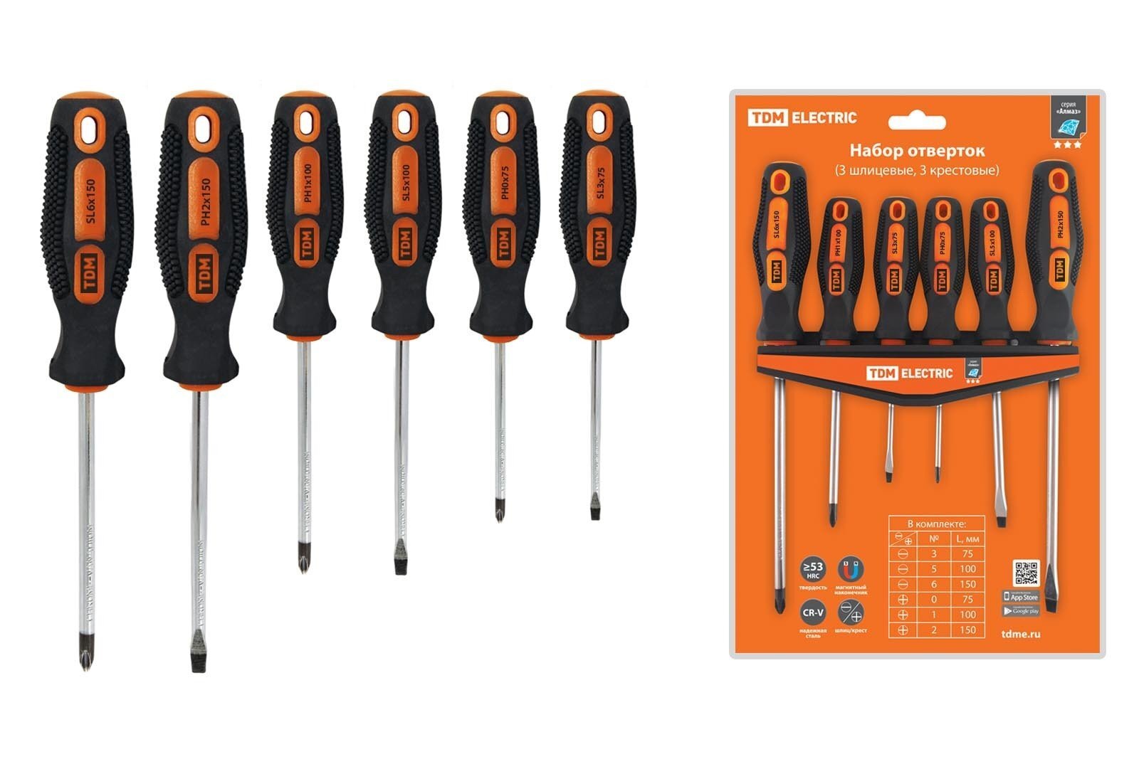 Набор отверток TDM ЕLECTRIC Набор отверток 6 шт.: SL:3x75;5x100;6x150, PH:0х75;1x100;2x150, пластиковый держатель, CR-V "Алмаз" TDM (SQ1013-0207)
