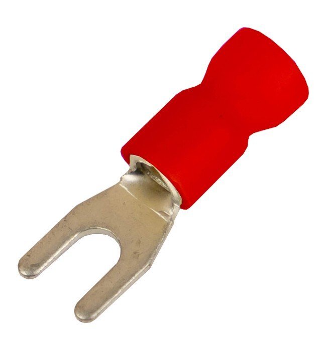 Наконечник вилочный с изолированным фланцем ПВХ под провода для проводников сечением 0,25-1,5 мм?, метрический размер болта М3,5 (D3,7мм), медь, цвет красный