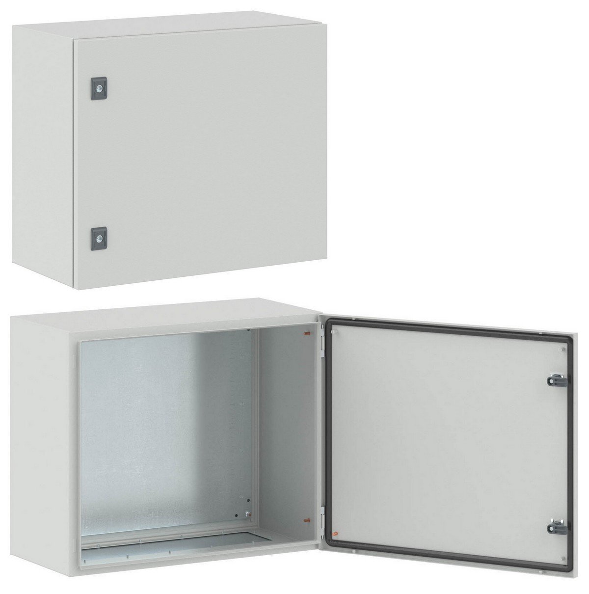 Корпус, монтажная плата, дверь, замок, фланец для ввода кабеля, монтажные аксессуары.
