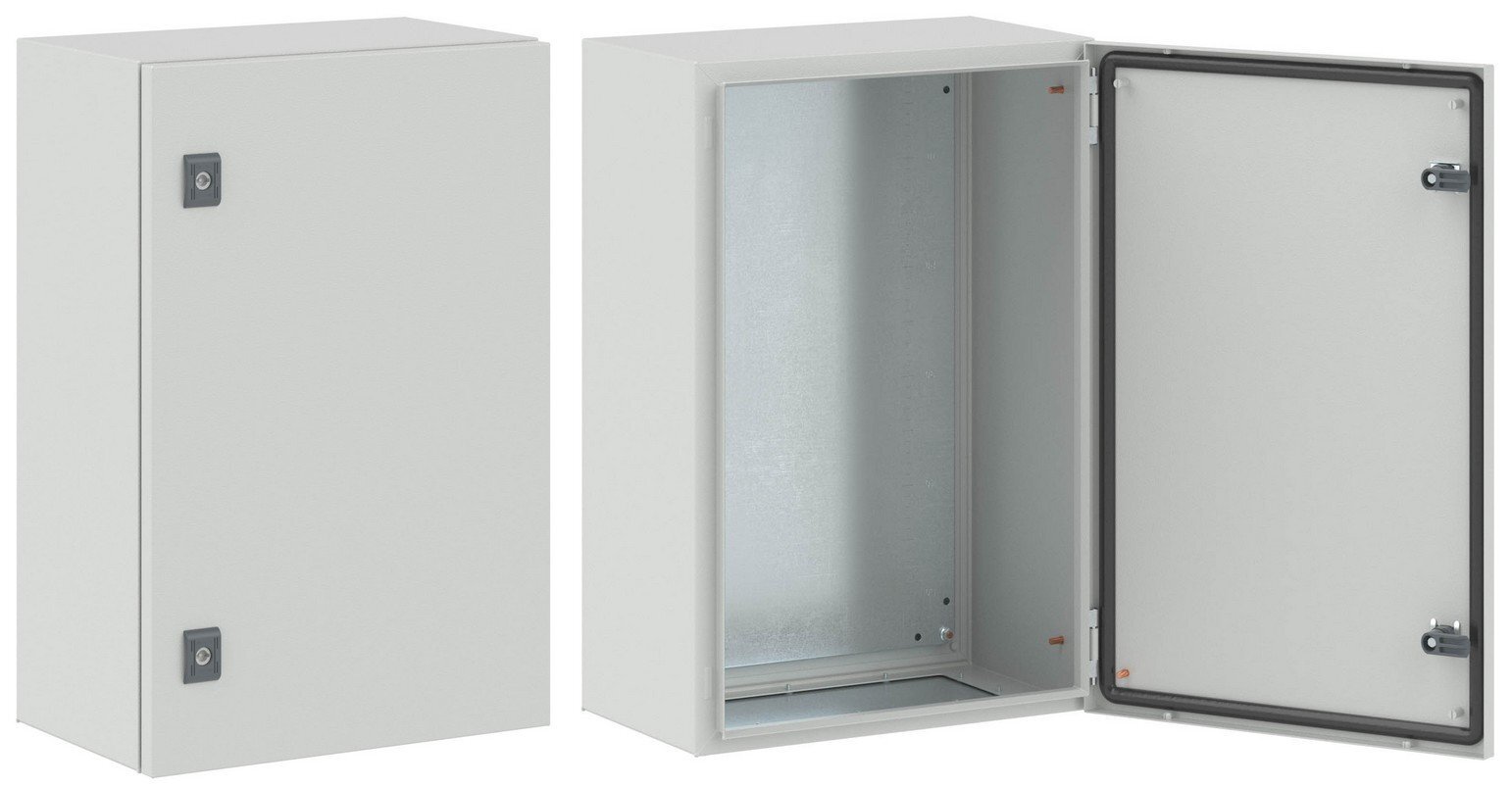 Корпус, монтажная плата, дверь, замок, фланец для ввода кабеля, монтажные аксессуары.