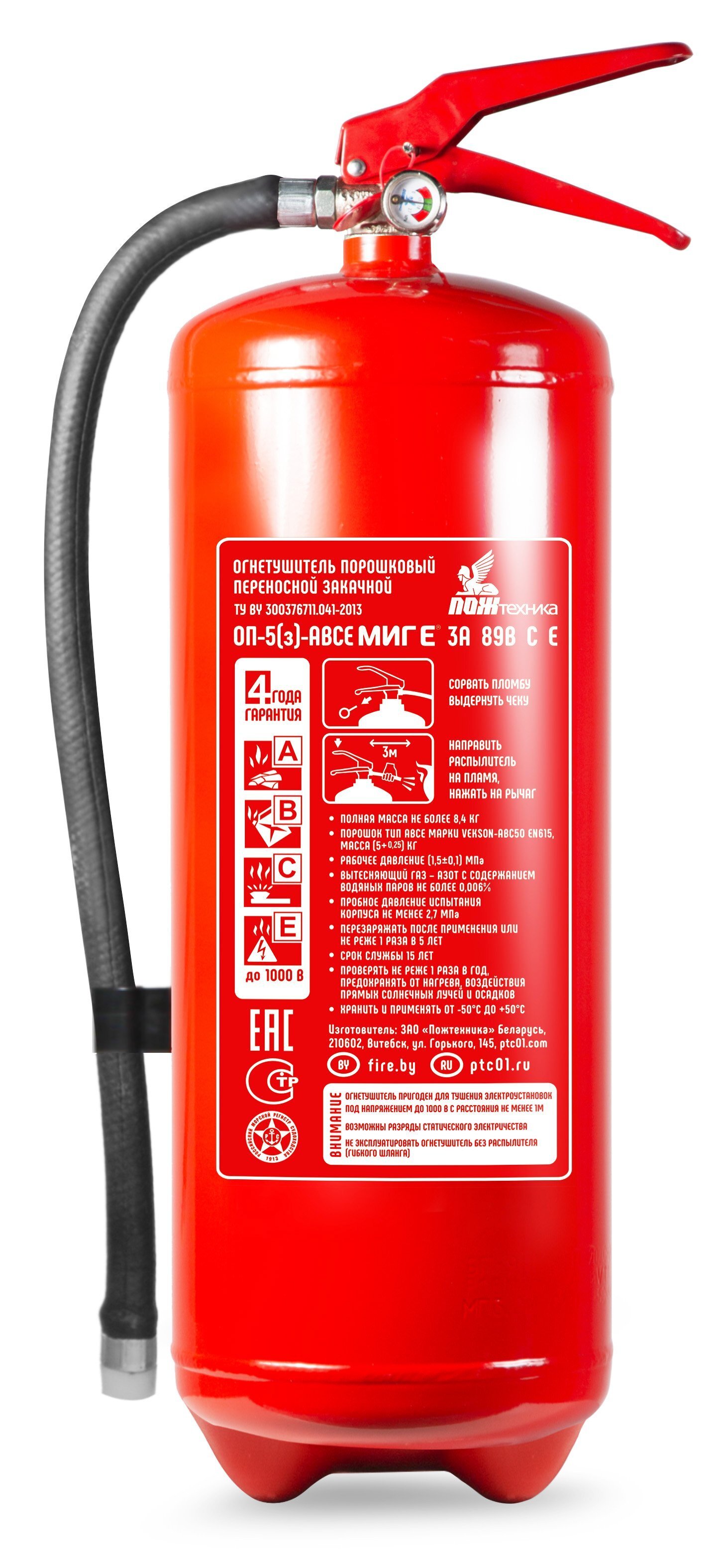 Класс пожара 3А; 89В | Срок службы огнетушителя, лет 15 |