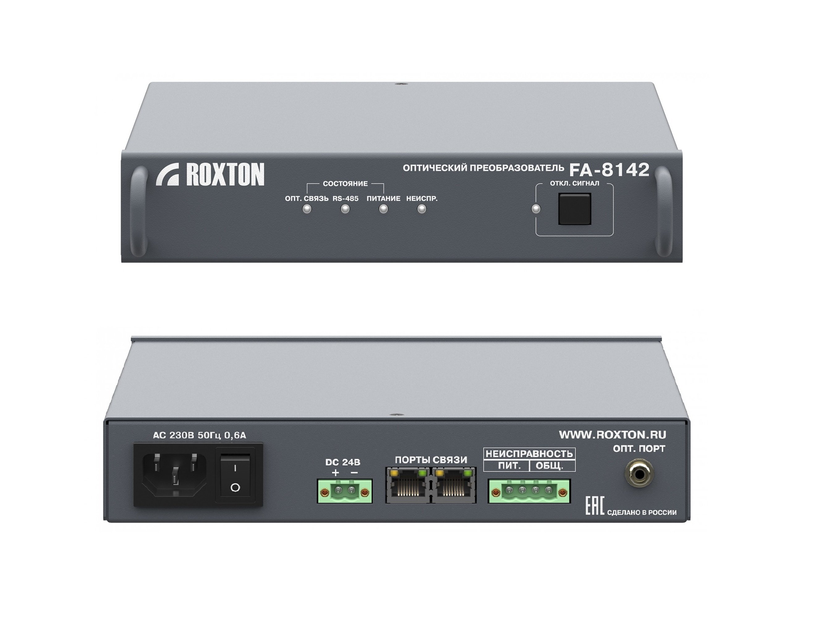 Связка оптических преобразователей ROXTON FA-8142 и ROXTON FB-8143 предназначена для работы в составе распределенной цифро-аналоговой системы оповещения ROXTON 8000 и позволяет увеличить расстояние как между стойками системы, так и между её отдельными блоками с 1200 метров до 20 километров.