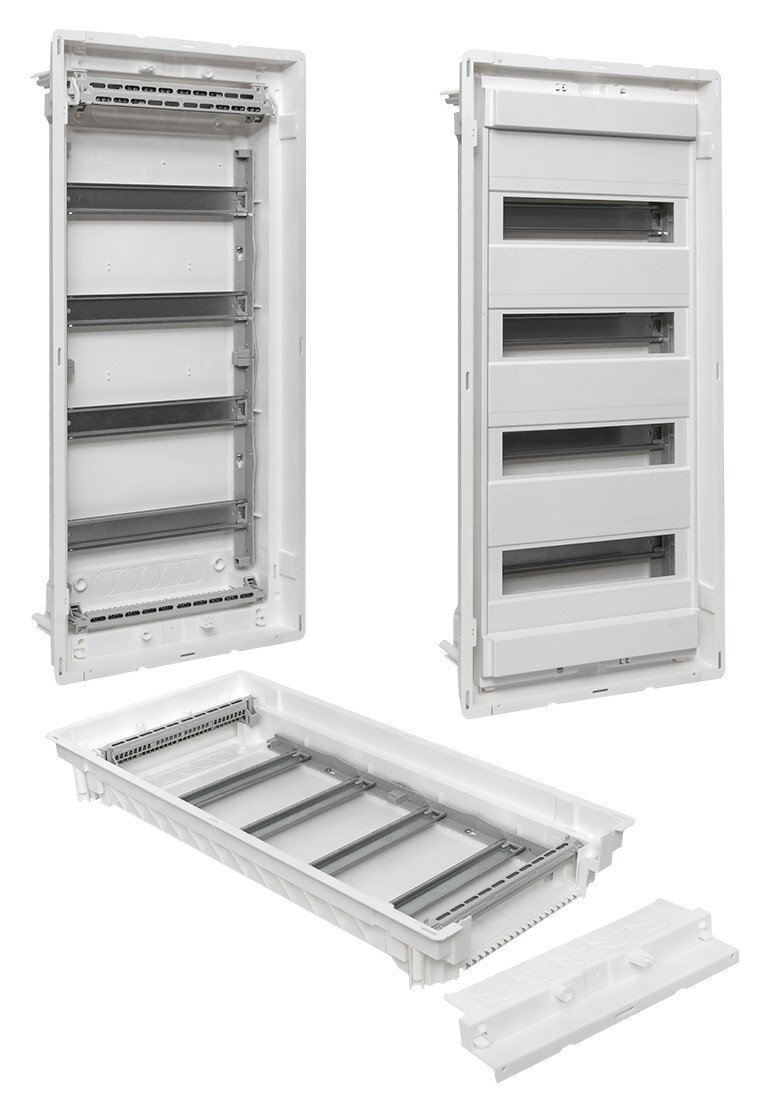 Корпуса пластиковые серии «Nova» предназначены для сборки силовых, слаботочных и комбинированных щитов. На DIN-рейки устанавливается модульное оборудование. На монтажные платы – антенные разветвители, Wi-Fi роутеры, патч-панели и иное слаботочное оборудование. Щиты устанавливаются как в бетонные и кирпичные стены, так и в гипсокартон, монтажные комплекты для установки в гипсокартон входят в комплектацию оснований щитов либо в комплектацию щитов в сборе. Двери щитов можно выбрать их разных материалов – пластик, металл или металл с перфорацией. Также доступны дополнительные аксессуары, необходимые для установки мультимедийного оборудования и существенно упрощающих монтаж щитов. Есть возможность приобрести как отдельно основание щита и дверь, так и основание с дверью в комплекте в одной коробке. Основные преимущества: съемные шасси с din-рейками, съемные кабельные фланцы, гребенка для фиксации входящих проводников, регулировка дверей по глубине, современный минималистичный дизайн