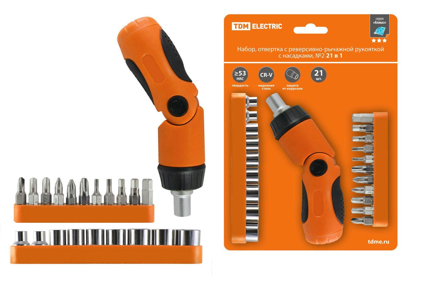 Отвёртка TDM ЕLECTRIC Набор, отвертка с реверсивно-рычажной рукояткой с насадками №2, 21 предмет "Алмаз" TDM (SQ1019-0202)