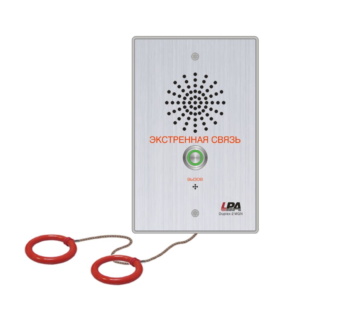 Стропа с двумя кольцами на разной высоте для активации вызова, Подключение дополнительной кнопки вызова, Выход 24В для светозвукового оповещателя, Система подавления эха, Алюминиевый корпус,