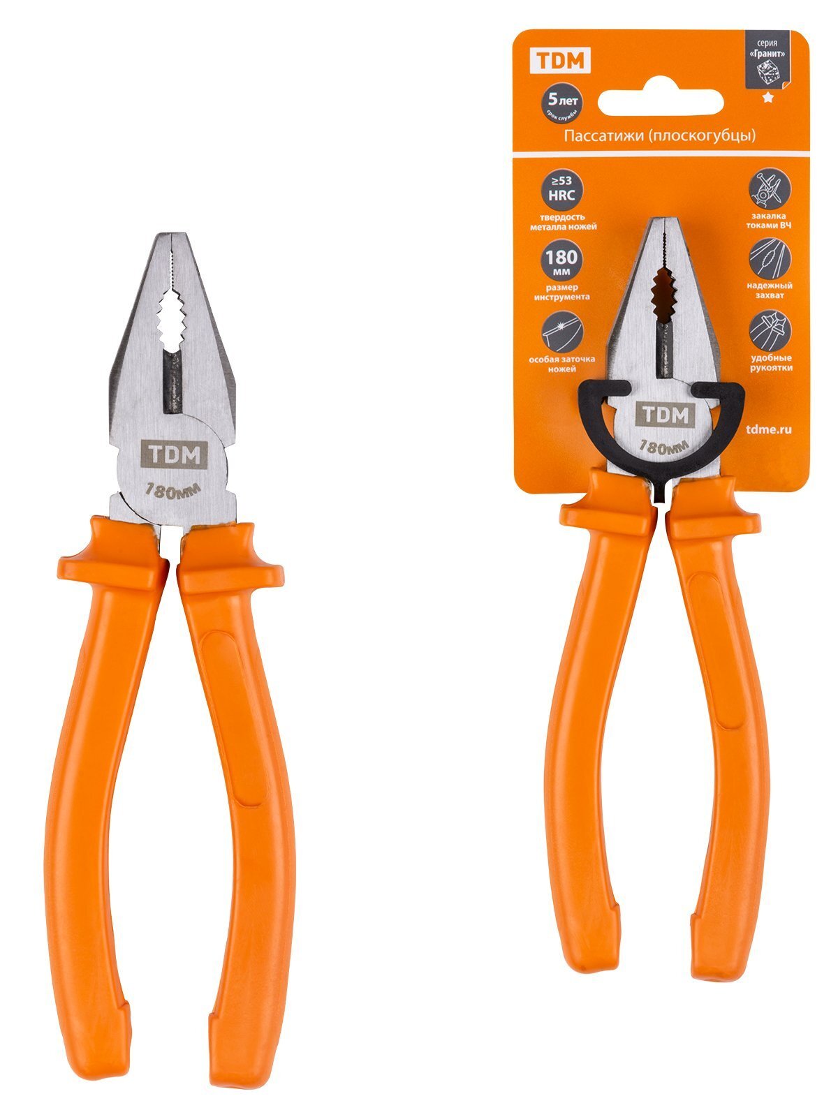 Пассатижи TDM ЕLECTRIC Пассатижи (плоскогубцы), с пластиковыми рукоятками, углеродистая сталь, 180мм "Гранит" TDM (SQ1009-0102)