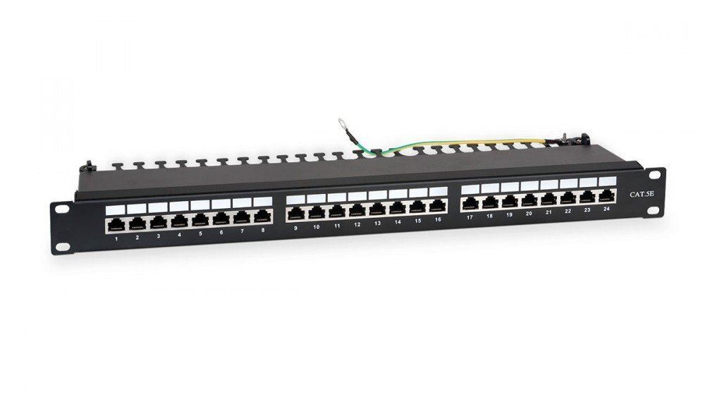 Патч-панель 19"(1U), 24 порта RJ-45 экранированная, категория 5e, Dual IDC, цвет черный.