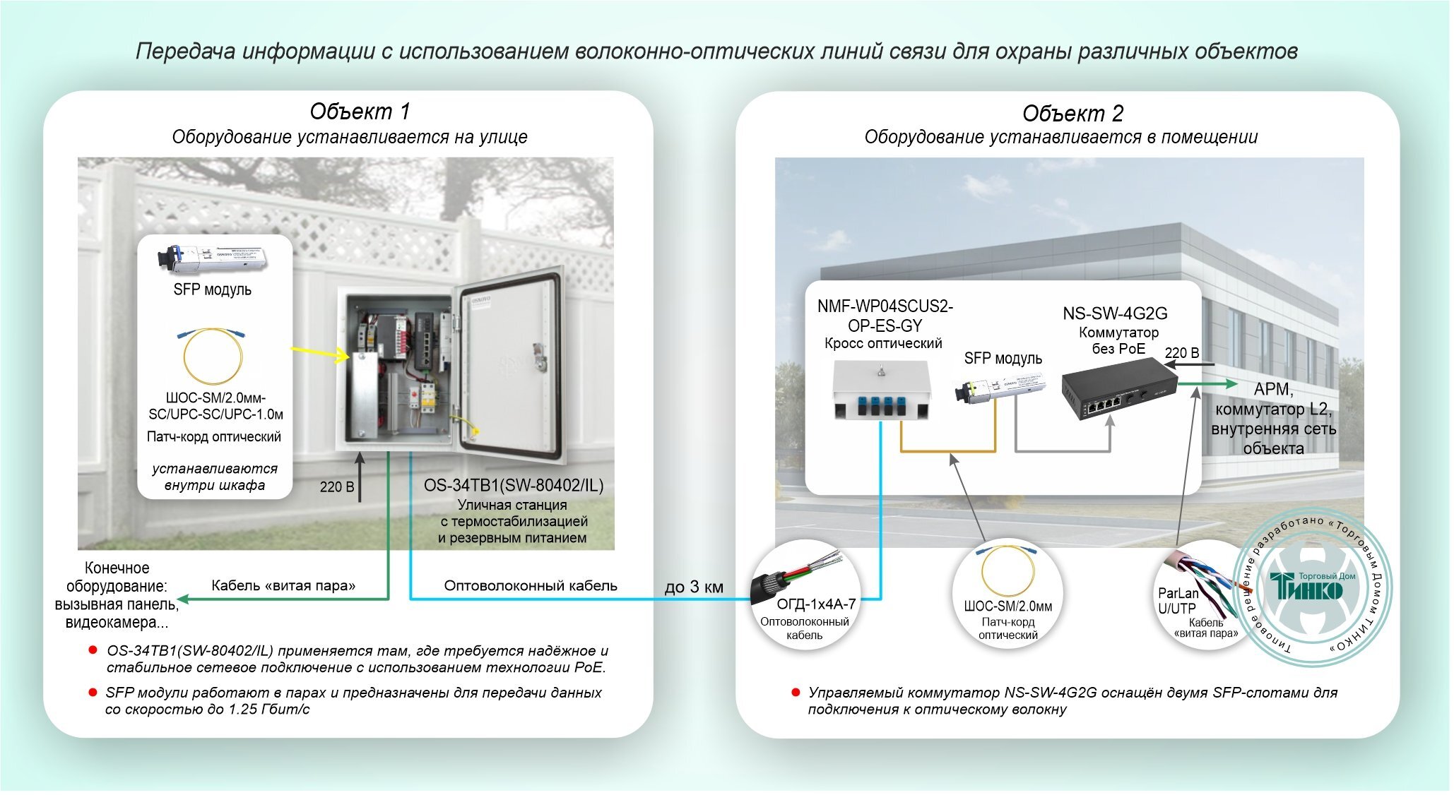 Передача информации с использованием волоконно-оптических линий связи для охраны различных объектов OSNOVO Типовое решение: ТСН-028
