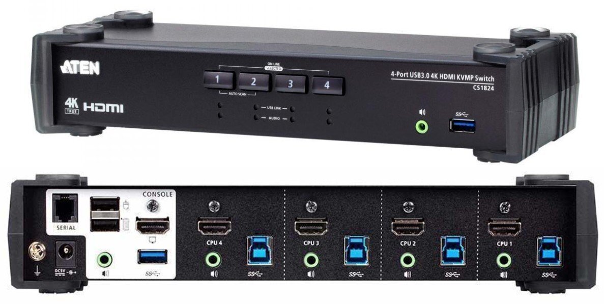 ATEN CS1824 KVMP™-переключатель, который позволяет с помощью одной USB-клавиатуры, мыши и HDMI-монитора осуществлять простое управление четырьмя компьютерами, оснащенными интерфейсом HDMI. Поддерживая высочайшее качество изображение вплоть до 4K DCI (4096 x 2160 при 60 Гц), KVMP™-переключатель CS1824 оптимизирует многозадачную работу пользователей.