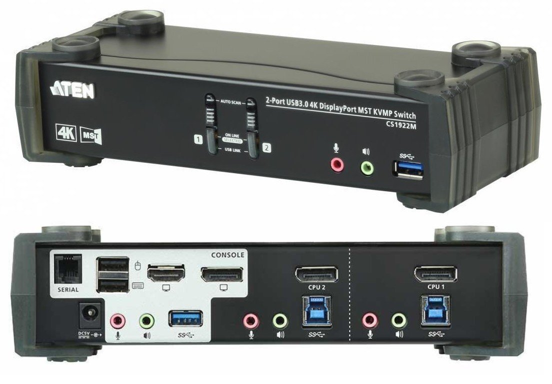 CS1922M-AT-G - 2-х портовый KVM Переключатель ATEN CS1922M с поддержкой USB 3.0 и 4K DisplayPort со встроенным концентратором MST с новейшей технологии Multi-Stream Transport. Обладая возможностями работы в режиме расширения изображения на два монитора (extended desktop mode) или вывода двух раздельных изображений (splitter mode) с разрешением уровня 4K с одного порта DisplayPort 1.2, KVMP™-переключатель CS1922M позволяет пользователям, обладающим двумя дисплеями организовать многозадачность, при этом уменьшив объемные кабельные соединения.
