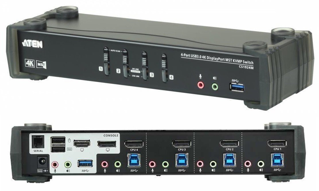 CS1924M-AT-G - 4-х портовый KVM Переключатель ATEN CS1924M с поддержкой USB 3.0 и 4K DisplayPort со встроенным концентратором MST с новейшей технологии Multi-Stream Transport. Обладая возможностями работы в режиме расширения изображения на 2 монитора (extended desktop mode) или вывода 4 раздельных изображений (splitter mode) с разрешением уровня 4K с одного порта DisplayPort 1.2, KVMP™-переключатель CS1924M позволяет пользователям, обладающим 2 дисплеями организовать многозадачность, при этом уменьшив объемные кабельные соединения.