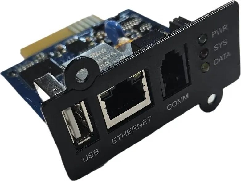 SNMP-карта предназначена для мониторинга состояния и управления ИБП по ЛВС или интернет; мониторинг, управление и конфигурация осуществляются через встроенный WEB-интерфейс, TelNet или NMS; 1хRJ-45, 1хUSB, 1хCOMM; RS-232; TCP/IP, UDP, SNMP, Telnet, SNTP, PPP, HTTP, SMTP, MQTT; 67х69х43 мм
