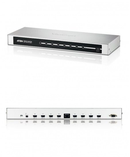 Переключатель Switch, HDMI, 8> 1 монитор/port, без шнур., (20 метр.(24AWG)/15 метр.(28AWG); 1900x1200 60Гц; HDTV 480p/720p/1080i/1080p; пульт Д/У; порт RS232; 5 лет гар+электростраховка; VS810HDMIR; GEFEN EXT-HDMI1.3-841), БП в комплекте, DC 5В, 3.7Вт, 0…+40°C, 437х158х44 мм.