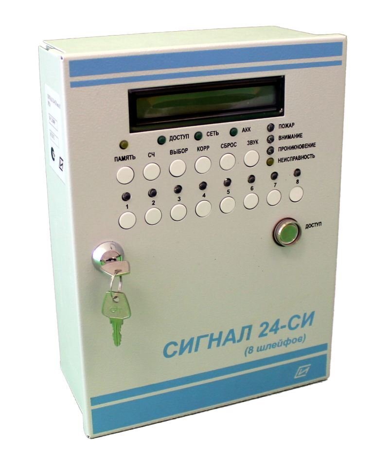Приемно-контрольный прибор ППКОП «Сигнал 24-СИ» исп.03 (8 ШС), предназначен для организации систем пожарной и охранной сигнализации на объектах различного назначения. Обеспечивает прием и отображение извещений из каждого ШС от пожарных или охранных извещателей, непосредственное включение внешних светового и звукового оповещателей с контролем исправного состояния линий подключения, трансляцию на любой ПЦН извещений «Пожар», «Неисправность», «Охрана-проникновение», а также включение цепей систем пожаротушения и дымоудаления.