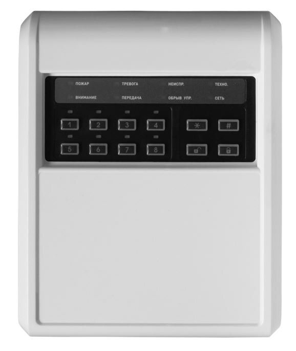 - прибор имеет 8 шлейфов сигнализации с возможностью программирования назначения, режима работы и объединения их в разделы, исходя из потребности на объекте;