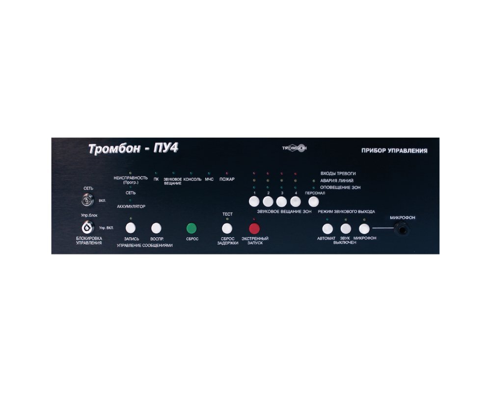 Прибор управления оповещением для СОУЭ 3 и 4-го типа; напряжение питания 220 В 50 Гц, встроенный блок резервного питания 12 В; зон оповещения 5 (4+1 "Зона персонала"), вход ГО и ЧС, встроенный звуковой процессор на 2 сообщения по 60 сек., порт для подключения удаленных консолей Тромбон-УК, интерфейс для подключения ПК и сопряжения с системами безопасности Интеллект+ и GOAL, контроль всех линий связи, габариты 438х321х132мм (3U), 7 кг
