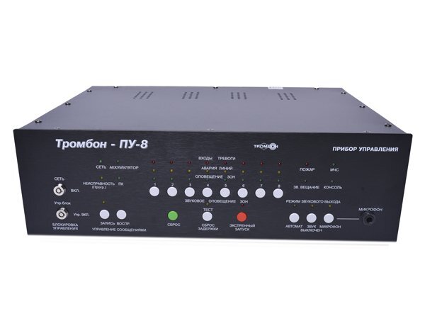 Прибор управления пожарный для управления средствами оповещения «Тромбон - ПУ-8» предназначен для построения системы оповещения и управления эвакуацией (СОУЭ) 3 – го, 4 – го и 5 – го типов.