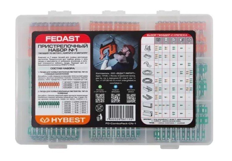 Комплект из 9 видов гвоздей по бетону, кирпичу и металлу необходим для подбора длины и типа гвоздя в зависимости от материала основания, в который планируете забивать гвоздь. Гвозди подходят для использования с газовыми монтажными пистолетами по бетону HYBEST и TOUA