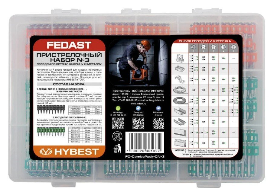 Комплект из 9 видов гвоздей по бетону, кирпичу и металлу необходим для подбора длины и типа гвоздя в зависимости от материала основания, в который планируете забивать гвоздь. Гвозди подходят для использования с газовыми монтажными пистолетами по бетону HYBEST и TOUA