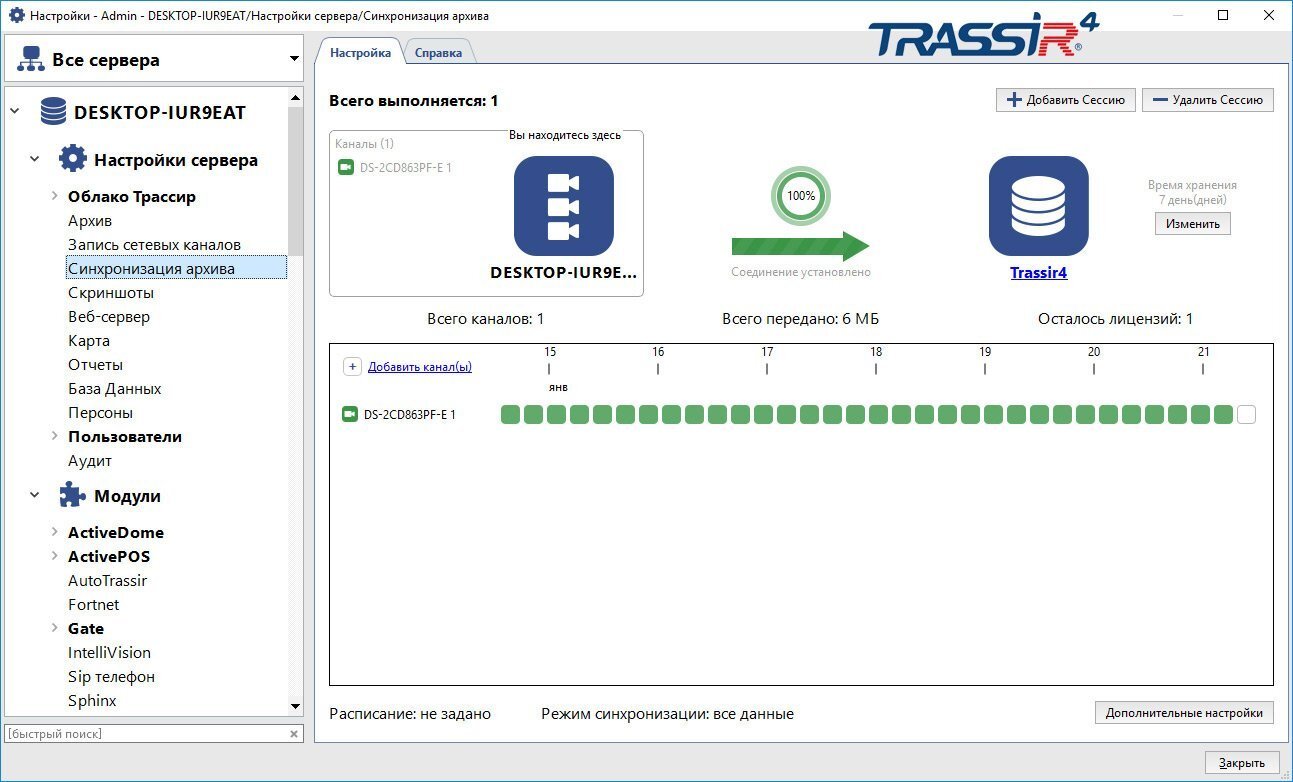 TRASSIR NetSync - профессиональное ПО для синхронизации архива 1-го любого видеоканала с другого сервера TRASSIR (через сеть, используется для повышения надежности, резервирования или дублирования архивов в распределенных системах). Поддержка синхронизации архива основного и/или дополнительного потоков видеоканала. Синхронизируется весь архив или архив по тревожным событиями. Постоянно (по доступности канала связи) или по расписанию. Стоимость подключения 1 канала видео. USB-TRASSIR приобретается отдельно.