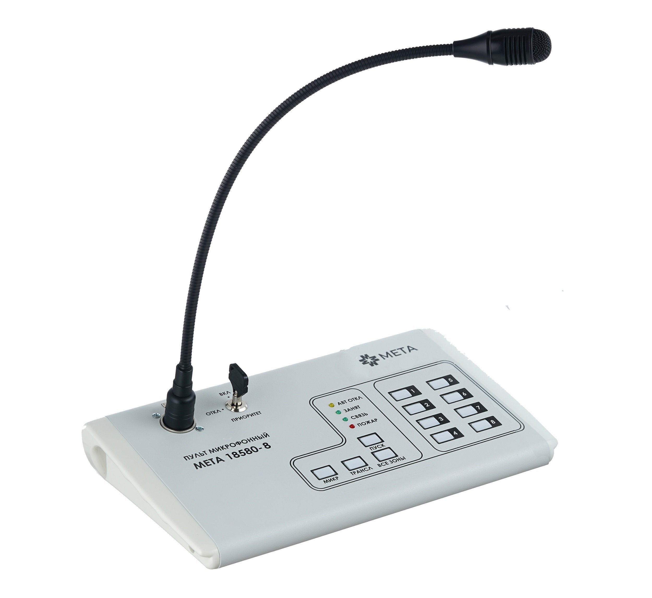 Пульт микрофонный МЕТА 18580 (МП) предназначен для работы в составе системы оповещения, совместно с приборами МЕТА 17820/17821, МЕТА 7122М. Микрофонный пульт обеспечивает возможность речевого оповещения от микрофона и подачи сигнала оповещения «СИРЕНА». Удаление микрофонного пульта от прибора оповещения до 1000 м. Питание микрофонного пульта осуществляется от приборов МЕТА 17820/17821, МЕТА 7122М, МЕТА 19830. Внешнее питание не требуется. Микрофонный пульт МЕТА 18580 предназначена для работы на столе.