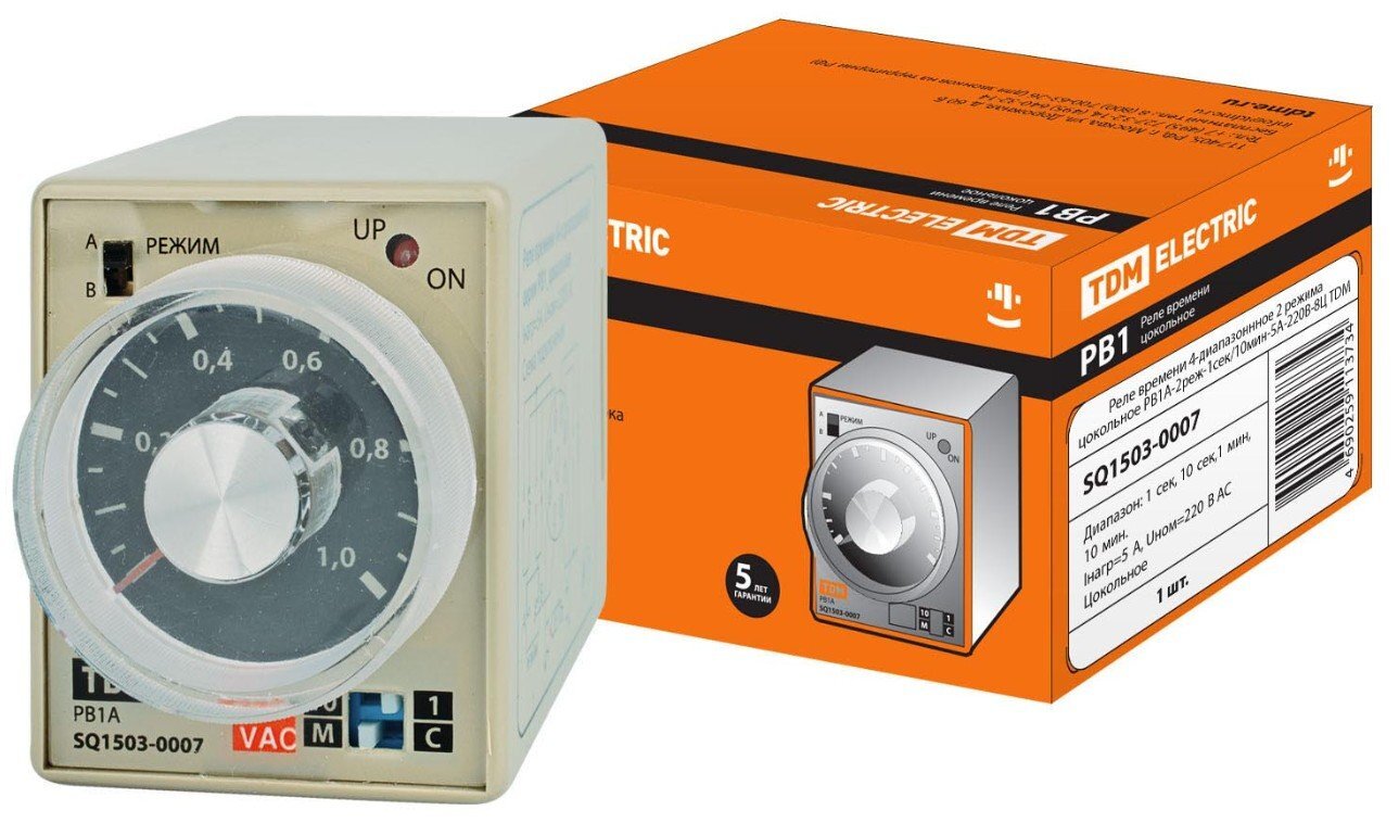 Реле времени для коммутации электрических цепей с выдержками по времени; подключение через разъем Р8Ц (приобретается отдельно); U-ном. 220 В, I-ном. 5 А, 2 х НЗ/НР-контакта; 2 режима работы (режим А - задержка включения, режим В - задержка включения+индикация пит.напряжения), устанавливаемые интервалы времени работы 1 сек/10 сек/1 мин/10 мин; t-раб.-10...+55°С, габ.размеры ВхГхШ 50х82х40 мм