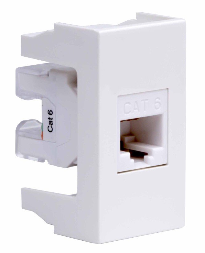 Компьютерная розетка. Назначение: подсоединение кабеля к компьютеру, принтеру и прочей оргтехнике. Характеристики: 8Р8С; комплектуются одномодульным гнездом; для заделки контактов в розетки использовать инструмент типа 110. RJ-45. Категория: 6. Тип гнезда: Keystone. Производитель гнезда: Hyperline. Установочный размер: 45х25. Кол-во модулей: 1. Цвет: белый