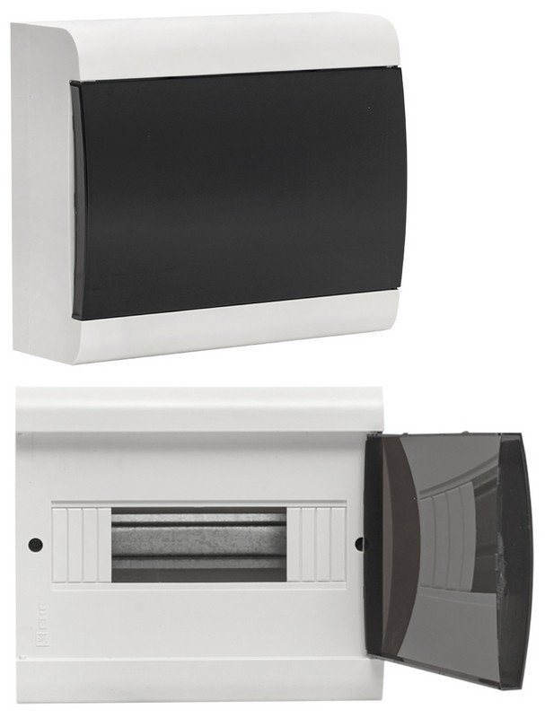 Щиток модульный с затемненной дверцей, настенный, корпус АБС-пластик; типоразмер: 1 ряд, 10 модулей; DIN-рейка и шины N(PE) в комплекте, U-номин. 400 В, I-номин. 125 А, УХЛ3, IP41, t-раб. -25...+50 °С, габ.размеры (ВхШхГ) 198х226х94 мм