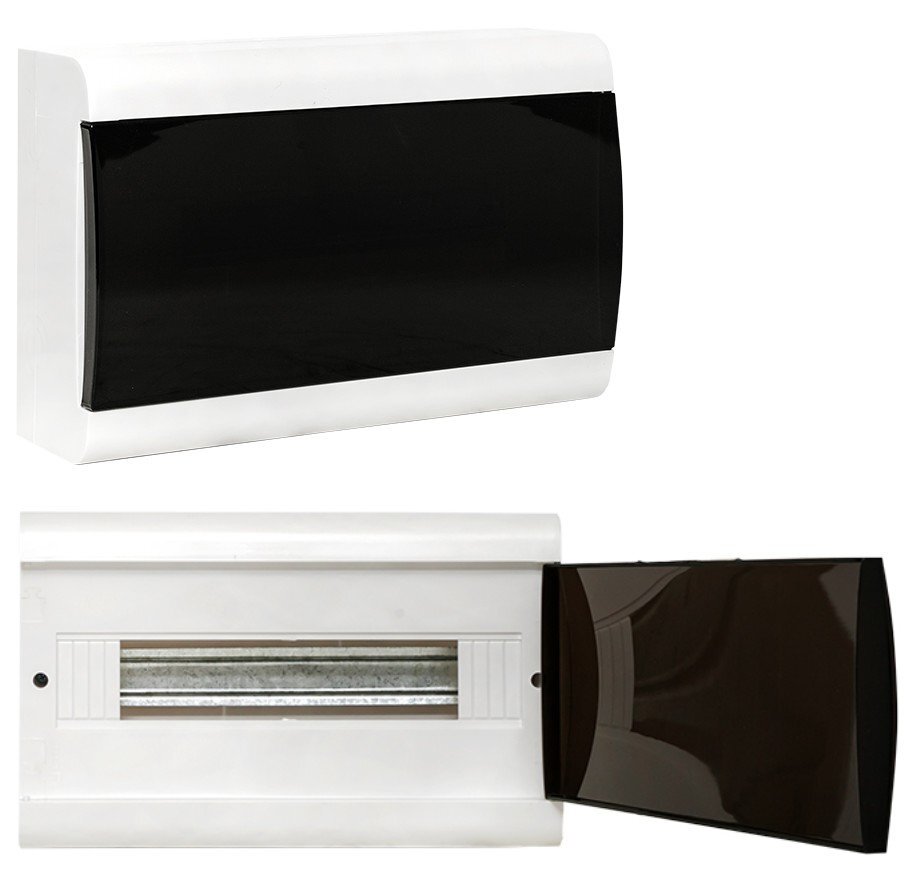 Щиток модульный с затемненной дверцей, настенный, корпус АБС-пластик; типоразмер: 1 ряд, 18 модулей; DIN-рейка и шины N(PE) в комплекте, U-номин. 400 В, I-номин. 125 А, УХЛ3, IP41, t-раб. -25...+50 °С, габ.размеры (ВхШхГ) 197х369х95 мм