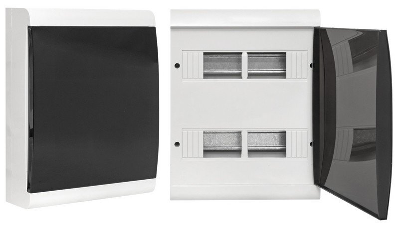 Щиток модульный с затемненной дверцей, настенный, корпус АБС-пластик; типоразмер: 2 ряда, 24 модулей; DIN-рейка и шины N(PE) в комплекте, U-номин. 400 В, I-номин. 125 А, УХЛ3, IP41, t-раб. -25...+50 °С, габ.размеры (ВхШхГ) 335х261х97 мм