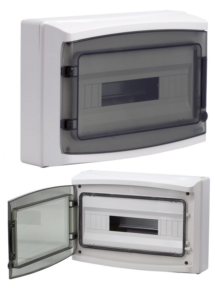 Настенный модульный щиток с прозрачной затемненной дверцей. Предназначен для монтажа в жилых и административных помещениях для установки автоматических выключателей любых производителей: таймеров, устройств защитного отключения и управления освещением и т.д. В комплект поставки входят: клеммные блоки 2 x (2x16mm2 + 12x10mm2), ручка на дверце, оцинкованная DIN-рейка, заглушки для пустых модулей, заглушки на пазы для крепления к стене, сборочные винты. Степень пыле- и влагозащиты IP 65. Ударопрочность корпуса IK09. Количество модулей - 18. Параметры щитка: ширина - 408 мм, высота - 280 мм, глубина - 133 мм. Материал - термостойкий пластик. Цвет - серый.