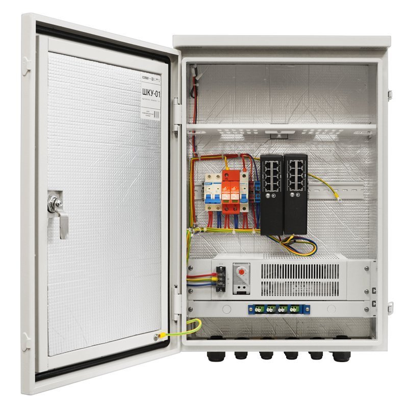 Шкаф оснащён системой поддержания микроклимата с помощью встроенных элементов: обогревателя, вентилятора и термостата с возможностью установки температуры включения обогрева. Так же, состав шкафа, входит дополнительный вентилятор малой мощности, уставленный в верхней части корпуса, для улучшения рециркуляции воздуха и снижения риска возникновения конденсата. Вентилятор подключен через отдельный автоматический выключатель.
