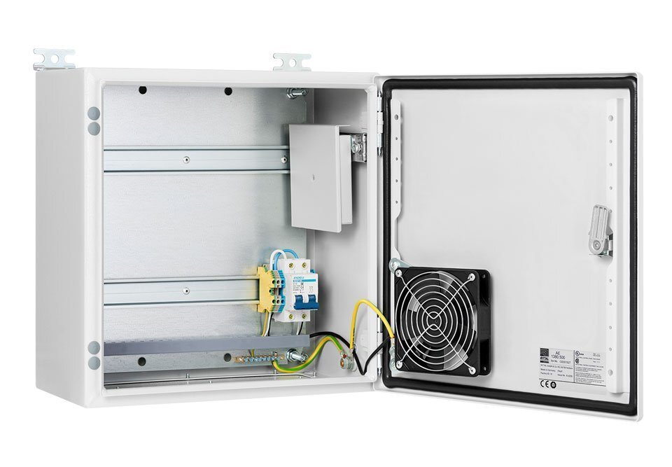 Шкаф монтажный всепогодный из листовой стали с порошковым покрытием, в комплекте: гермовводы, проходные клеммы, двухполюсный автомат, шина заземления, вентилятор с термостатом, оптический кросс укомплектованный на 12LC/SC адаптеров; AC 100...240 В; IP66, -40...+60°C, 400х400х210 мм.