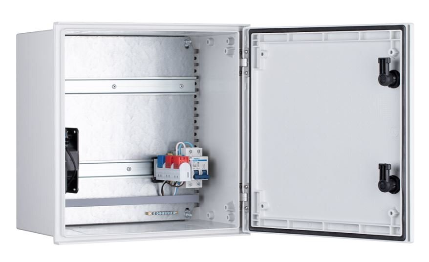 Шкаф монтажный всепогодный из армированного стекловолокном полиэстера, с монтажной панелью с DIN-рейками для клиентского оборудования, комплект [1,2] (с вентилятором и нагревателем); U-пит.100...240В, P-потр.100 Вт; IP66, t-раб.-40...+60°С, 400x400x200 мм. В комплекте гермовводы, проходные клеммы, двухполюсный автомат (10 А), шина заземления, вентилятор с термостатом, нагреватель с термостатом.